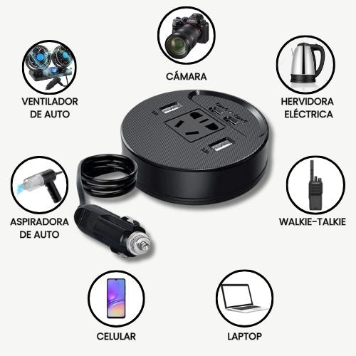 Solo conecta el inversor a la toma de encendedor de tu coche (12V o 24V). Luego enchufa tu cargador o dispositivo en el puerto de 220V o USB tipo C. ¡Listo! Carga rápida, segura y estable incluso en viajes largos o fuera de la ciudad.
